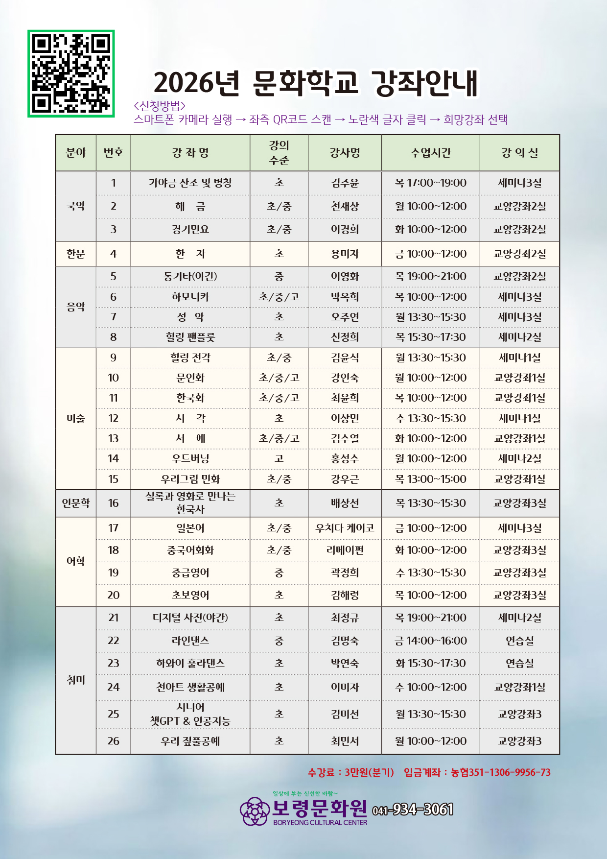 지역민의 삶의 질 향상과 평생학습 확산 및 문화감수성 계발을 위한 다양한 평생교육 강좌를 개설하여 운영 중입니다. 지역 전통문화 전승·보존과 건강한 여가활동을 통해 보람을 느낄 수 있는 문화학교가 될 수 있도록 더욱 알차고 내실 있는 프로그램을 개발·운영할 예정입니다.